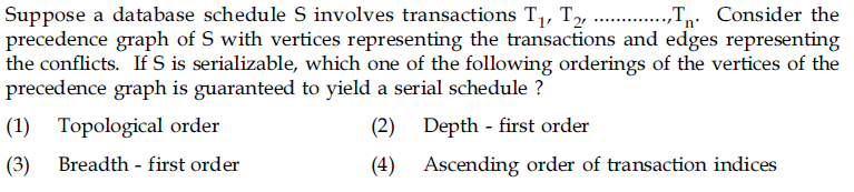 Suppose a database schedule S involves transactions T1, T2, .............,Tn. Consider the precedence graph of S with vertices representing the transactions and edges representing the conflicts. [N17P3Q8]